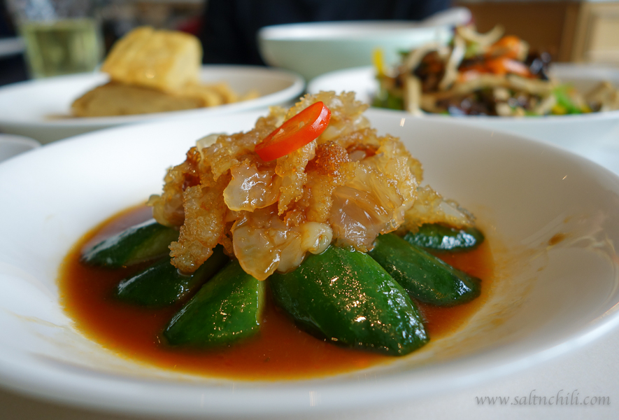 We started off with 3 appetizers, the Longhua Temple Bean Curd Skin Rolls, Marinated Jellyfish with Cucumber in Zhenjiang Aged Dark Vinegar and Shredded Beancurd & Assorted Vegetables. My favorite was the shredded beancurd because of the lightness of this colorful dish.