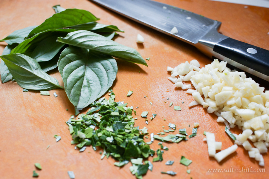 Finely chop the kaffir lime leaves and basil leaves. Mince the garlic.