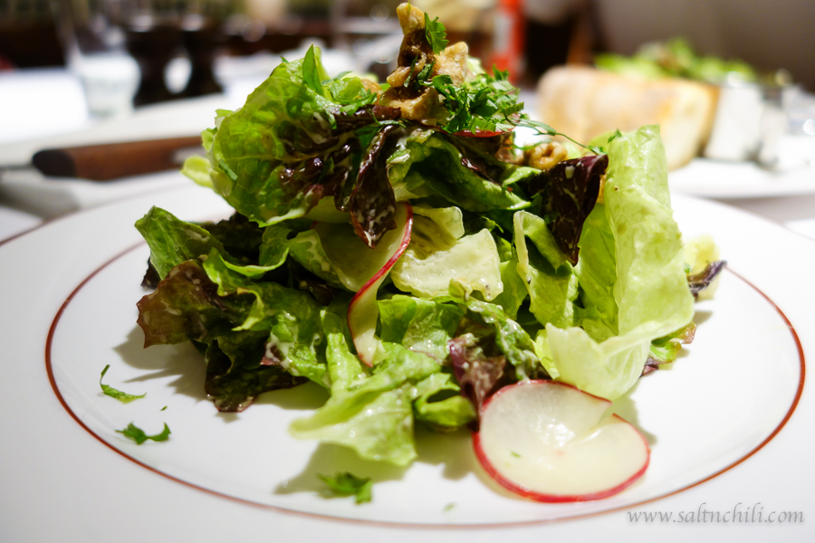 The meal starts off with a warm baguette to share, then a green salad with walnuts, radish and a vinaigrette dressing. The salad wasn’t anything special, but it was fresh and the portion was decent.