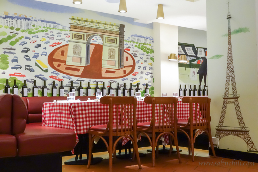 The decor is very bistro-inspired, with red and white checked table clothes and matching red banquettes. All the walls are colorfully painted with French monuments such as the Eiffel Tower and the Arc de Triomphe.