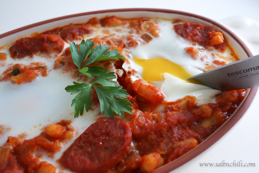 I made this for brunch today, and hubby and I enjoyed it very much. The smokiness of the paprika, spiciness of the chorizo and gooey-oziness of the egg made this dish a winner. Make sure to have plenty of bread to soak up the sauce!