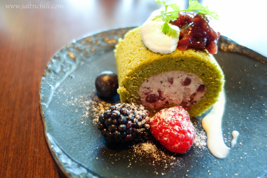 Lunch ended on a sweet note with a Japanese Green Tea Roll with Azuki and fresh berries. I savored every bite of this decadent dessert, while hubby said he thought it was a bit too sweet for his liking (so I happily helped him finish his!).