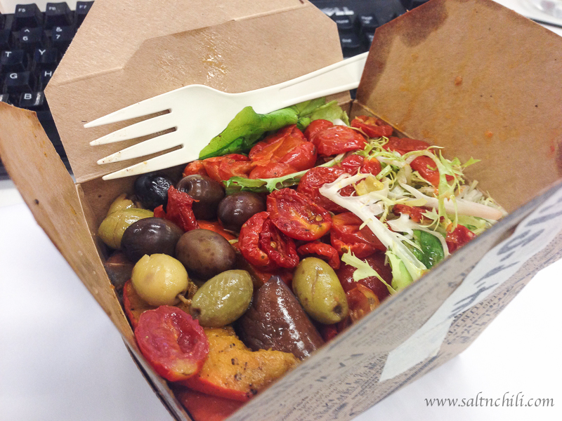 I’ve ordered meals from Caliburger and MANA! in recent weeks. The below is a Mixed Green, Roasted Veggie, Black Olives and Slow-Dried Tomatoes Salad from MANA! (Those sweet slow-dried tomatoes were soooo good!)