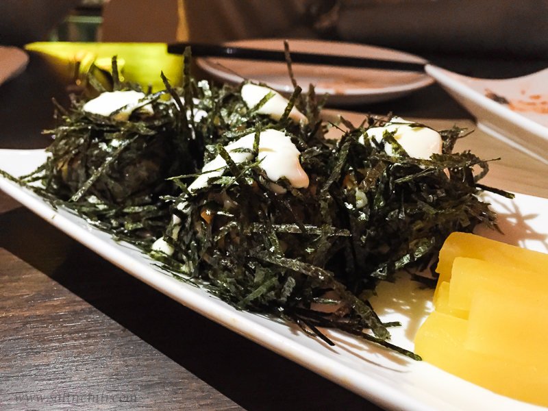 The description of the Kimchi Cheese Roll on the menu was “Rice Ball, Ham, Egg, Kimchi, Cream Cheese, Nori”. We really didn’t know what to expect of this dish, but we were very impressed when it arrived. My weak taste buds weren’t able to identify all the ingredients listed, but the combination of flavors and the delicacy of the dish left me in awe. It was obvious a lot of care was put into assembling these well-formed rice balls, coated with a generous amount of nori strips.