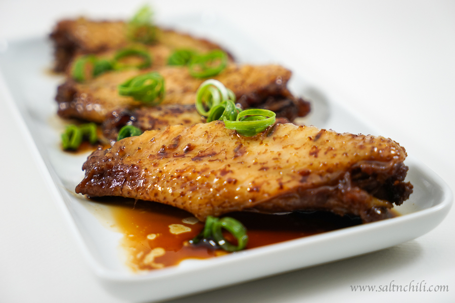 Plate the chicken wings and top with a little soy marinade and garish with spring onions.